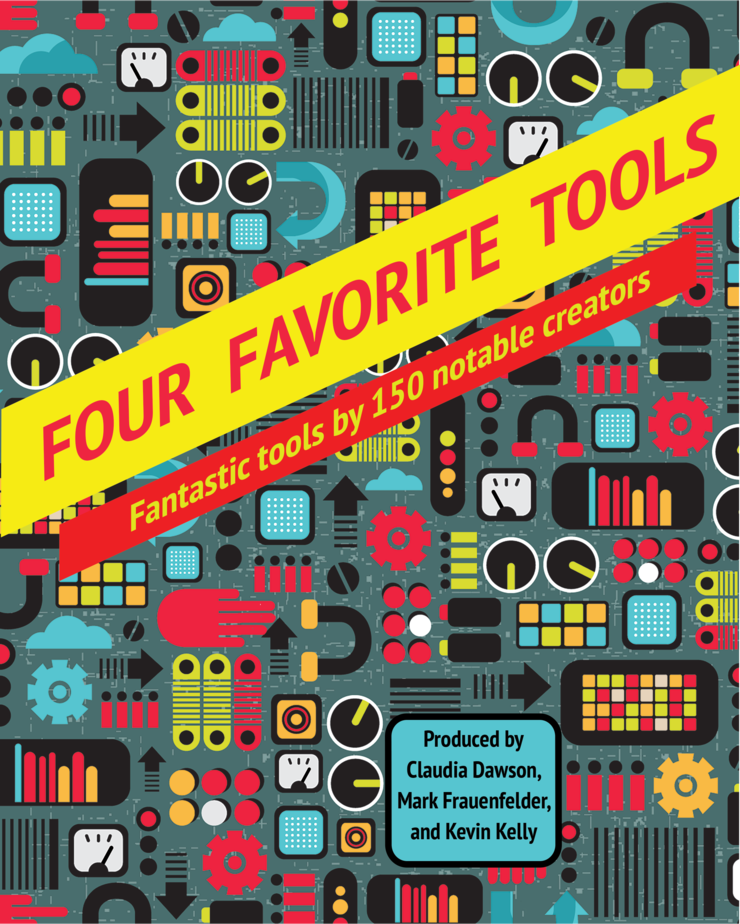 Kevin and Mark host a weekly podcast called Cool Tools. For more than 5 years now they have invited notable and creative people to talk about their favorite tools. This year, I took the transcripts from the best 150 episodes and pulled text, added images, and laid it all out in a 300-page book titled Four Favorite Tools. It is now available on Amazon in both color ($39.99) and B&W ($12.99) versions. Inside the book are hundreds and hundreds of recommendations for apps, gadgets, tools — but my recommendation is the book itself as a handbook for inspiration. — CD